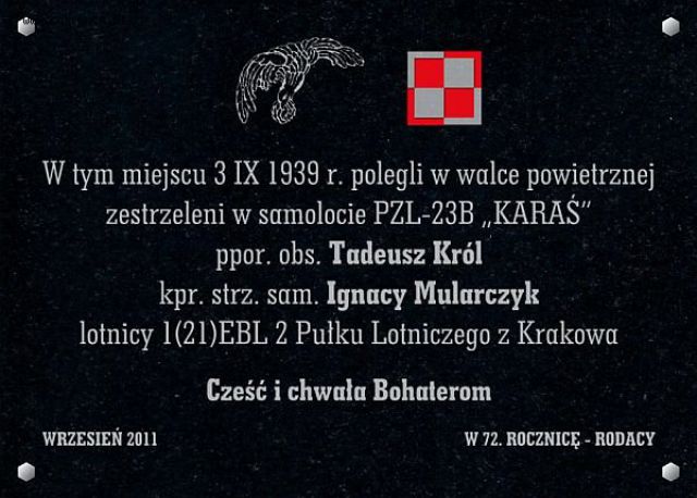 brodaamor Napisano 28 Sierpień 2011 Autor Napisano 28 Sierpień 2011 W 72 rocznicę zestrzelenia polskiego Karasia z 1(21) Eskadry Bombowej Lekkiej, 4 września o godzinie 12, na polach przysiółka Kozy koło Dąbrowy Wielkiej odbędzie się uroczystość upamiętniająca poległą w walce z niemieckimi myśliwcami załogę samolotu. 3 września 1939 roku w miejscu tym zginęli ppor. obs. Tadeusz Król i kpr. strz. sam. Ignacy Mularczyk.Historyczno-patriotyczna uroczystość odbędzie się 4 września w podsieradzkiej Dąbrowie Wielkiej. O godzinie 12, w przysiółku Kozy, w miejscu zestrzelenia samolotu PZL-23B Karaś z 1(21) Eskadry Bombowej Lekkiej 2 Pułku Lotniczego z Krakowa, zostanie odsłonięty obelisk poświęcony pamięci dwóch poległych członków załogi. Karaś został zestrzelony 3 września 1939 roku około godziny 17. Jak opowiadali świadkowie zdarzenia, polski samolot zaatakowały trzy Messerschmitty. Z trzech członków załogi tylko jeden ratował się skokiem ze spadochronem – kpr. pil. Stanisław Obiorek. Okoliczni mieszkańcy, którzy przybyli na miejsce upadku Karasia, w spalonych szczątkach znaleźli ciała dwóch lotników – ppor. obs. Tadeusza Króla i kpr. strz. sam. Ignacego Mularczyka. Obaj zostali pochowani tam, gdzie zginęli, pod usypaną z ziemi mogiłą.Kpr. pil. Stanisław Obiorek latał potem na Wellingtonach w 304 Dywizjonie Bombowym Ziemi Śląskiej. Zginął w styczniu 1942 roku – jego bombowiec nie wrócił na macierzyste lotnisko z lotu na bombardowanie niemieckiego Wilhelmshaven.Organizatorami uroczystości są wójt gminy Sieradz oraz Społeczny Komitet, w którym działa m.in. Robert Kielek z Sieradza. – Oprócz lokalnych władz, w uroczystości będą uczestniczyć między innymi dowódcy 32 Bazy Lotnictwa Taktycznego w Łasku oraz 15 Brygady Wsparcia Dowodzenia w Sieradzu, zaprosiliśmy także dowódcę Sił Powietrznych. Będą członkowie rodzin obu poległych lotników, spodziewamy się licznie przybyłych mieszkańców – mówi Robert Kielek, który był inicjatorem upamiętnienia załogi zestrzelonego samolotu. To w dużej mierze dzięki jego zaangażowaniu dziś już wiadomo, że 72 lata temu pod Dąbrową Wielką strącony został Karaś, a nie Czapla – jak przez wiele lat podawano w źródłach. Sprostowanie historii i dotarcie do faktów kosztowało mnóstwo pracy i wysiłku wielu osób, jako pierwszy na trop prawdy o tym zdarzeniu wpadł w 1989 roku inż. Juliusz Molski z Poznania, znany eksplorator wrześniowych pobojowisk lotniczych – ale więcej na ten temat wkrótce.W 1952 roku szczątki ppor. obs. Tadeusza Króla i kpr. strz. sam. Ignacego Mularczyka zostały przeniesione na cmentarz żołnierzy radzieckich w Sieradzu i spoczęły w zbiorowej mogile żołnierzy września 1939 roku.W miejscu upadku samolotu zostaną umieszczone głaz z pamiątkową tablicą oraz krzyż z przytwierdzonymi symbolicznymi, metalowymi elementami. Do ziemi wrócą też szczątki członków załogi wydobyte z tego miejsca podczas poszukiwań. Odnalezione fragmenty Karasia będą eksponowane w muzeum w Warcie, gdzie znajdują się m.in. pamiątki po słynnym polskim pilocie, Stanisławie Skarżyńskim. I poszukiwania, i przekazanie znalezionych elementów do muzeum odbyło się za zgodą służb ochrony zabytków. Dzięki zgodzie dowódcy 32 Bazy Lotnictwa Taktycznego w Łasku uroczystość odbędzie się z udziałem wojskowej kompanii honorowej.