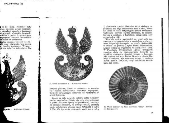 Rosforek Napisano 14 Listopad 2011 Napisano 14 Listopad 2011 „Podobno dużo orłów z KP było stalowych, stąd możliwy brak częstego odnajdywania ich nawet drobnych elementów.. Może Ci Wyro podniosę Ciśnienie, ale nie zdziwił bym się, gdyby ta czwórka to był kiedyś cały orzeł ;-)”Podobno. Orły z tego okresu były zazwyczaj wykonywane z cienkiej blachy mosiężnej, posrebrzanej, gdzie korona, dziób oraz szpony i cyfra z tarczki pułkowej (!) powinna być złocona. W okresie wybuchu powstania listopadowego orły były wybijane z tych samych sztanc , mniej starannie, z brakiem jakichkolwiek złoceń i wybijane nawet z blachy cynkowej. Czwórka pochodzi z tarczy pułkowej, tak jak koledzy identyfikowali. Skan przedstawia identyczną czwórkę (warto porównać). Osobiście mam 3 orzełki z tego okresu, niestety bez tarcz pułkowych, praktycznie każdy przedstawia różnorodność form sztanc (na jednym z trzech, na tarczy amazonek znajdują się inicjały, co jest wielką ciekawostką, a na jeszcze jednym… hmm :] )Tak czy siak bardzo fajne znalezisko, mama nadzieję że kolega znajdzie swojego orła z tego okresu bo są one przepiękne i ogromne.Skan/źródło pochodzi z książki: „Znak Wojska Polskiego” Bohdan Królikowski, Reszów 1988,