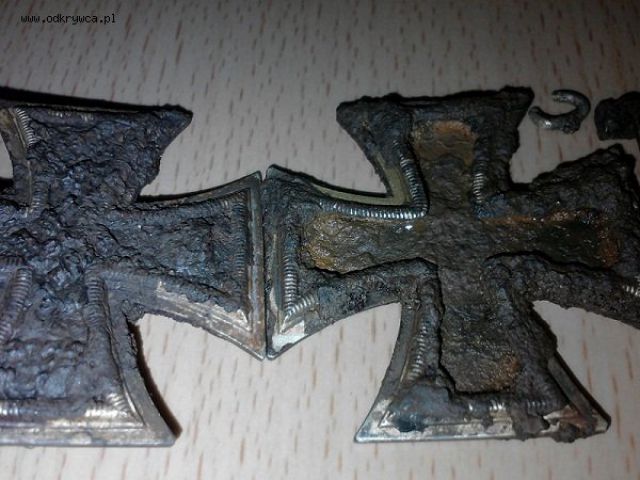 R51 Napisano 9 Grudzień 2011 Napisano 9 Grudzień 2011 Jak masz w elektrolizie żelazo i np. srebro, czy mosiądz, to będzie się tobie grzało jak s...n. Pamiętam jak kiedyś odrdzewiałem elektrolitycznie bagnet do lebela to termik co chwila odłączał mi prostownik. Na twoim miejscu bym tego nie elektrolizował, bo żelazny środek wygląda na mocno utleniony i możesz go stracić. Na twoim miejscu wymoczyłbym krzyże solidnie w środku zmiękczającym rdzę, np. w Action7 a potem zadziałał mosiężną szczotką czyszcząc zarówno posrebrzaną ramkę jak i żelazny środek. Metoda jest pracochłonna, ale krzyż będzie cały. Po wyczyszczeniu zabezpieczyłbym żelazo Ferstabem, który nadałby mu ciemny, nieal czarny kolor