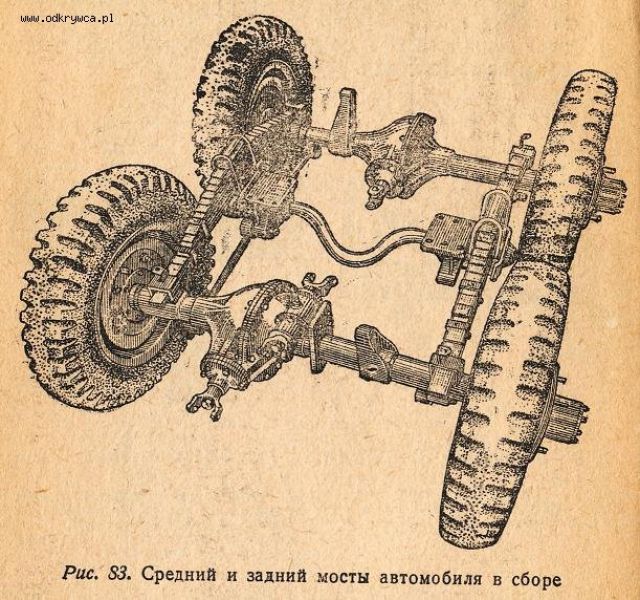 Dodge52 Napisano 7 Październik 2012 Napisano 7 Październik 2012 Widok lewej strony przedniego mostu napędowego: widoczny resor, mocowanie przedniego mostu, amortyzator ramieniowy, za nim ramię mechanizmu kierowniczego, połączonego za pomocą drążka kierowniczego z ramieniem zwrotnicy.Resor w tylne części zamocowany za pomocą sworznia ze smarowniczką, z przodu na wieszaku resoru mającym 2 smarowniczki