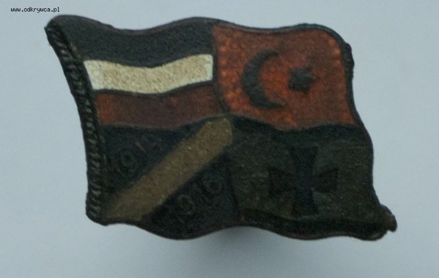 a77 Napisano 29 Październik 2012 Autor Napisano 29 Październik 2012 Wpinka z flagami niemiecką, turecka.Na fladze w lewym dolnym rogu daty 1914-1916.Wymiary:szerokość 35 mm wysokość 20 mm.