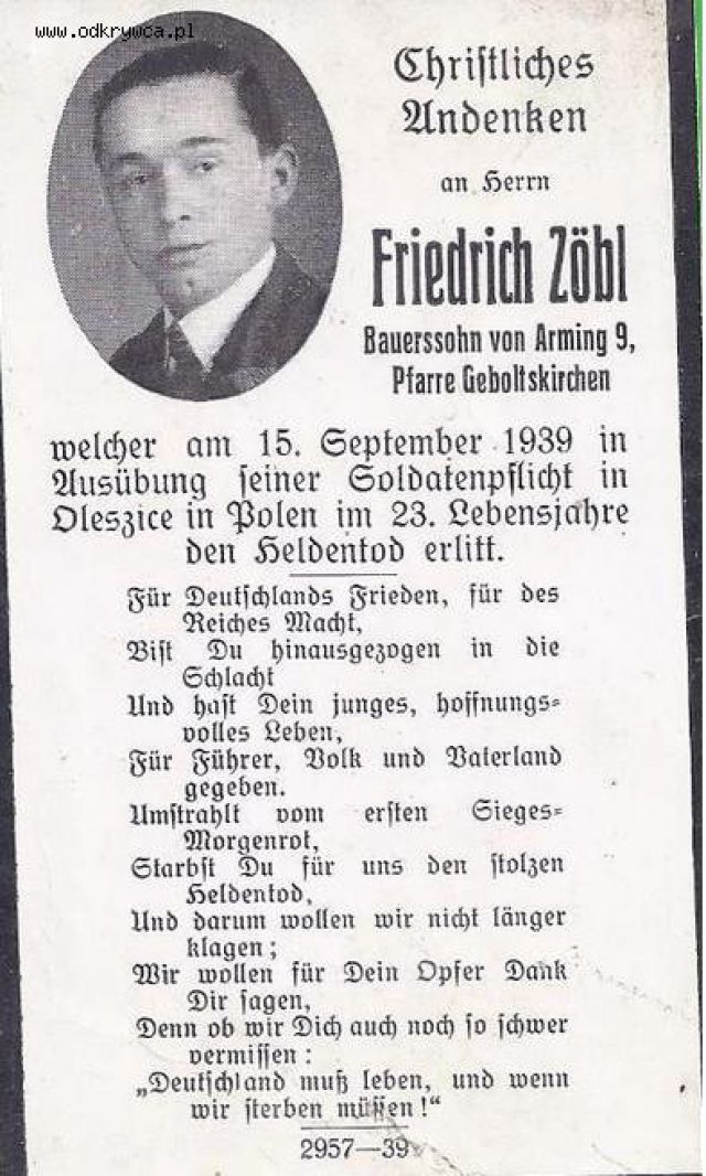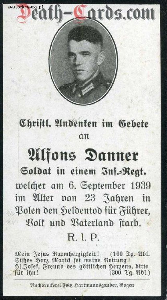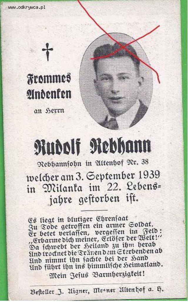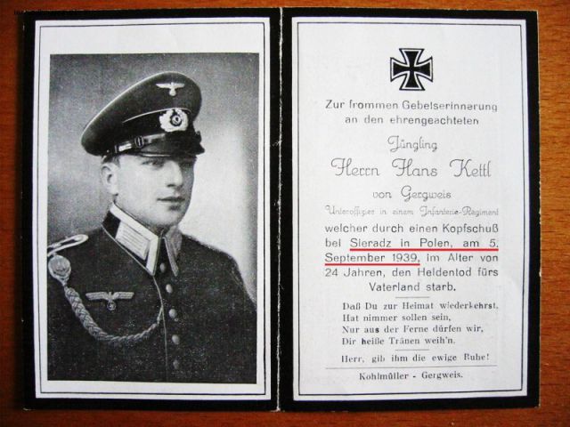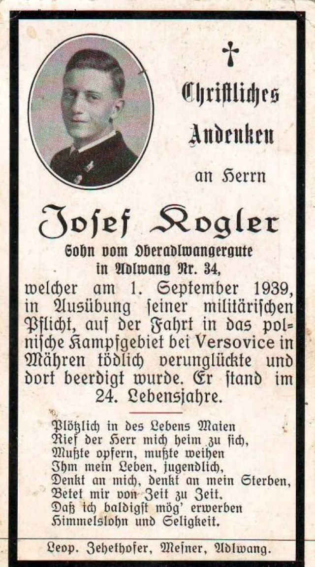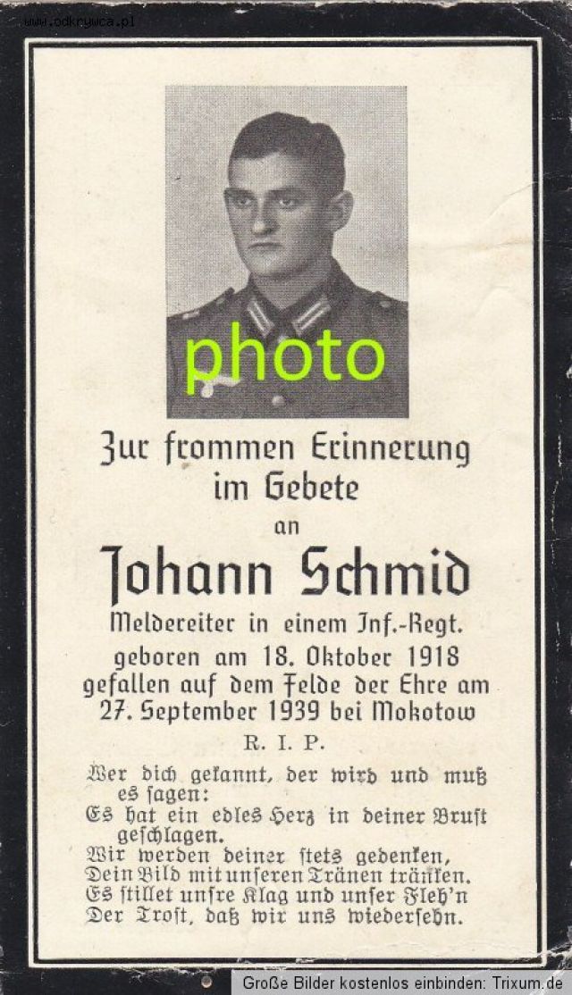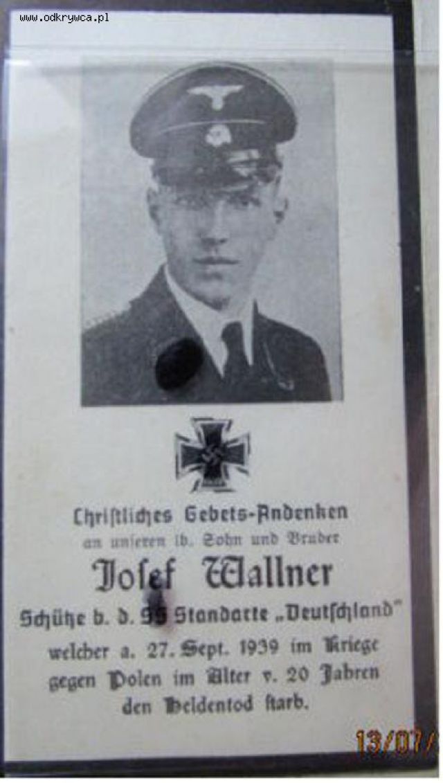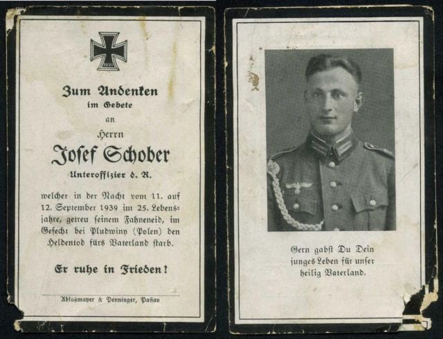 bodziu000000 Napisano 5 Lipiec 2015 Napisano 5 Lipiec 2015 Unteroffizier der Reserve Josef Schober welcher in der Nacht vom 11.auf 12.September 1939 im 25.Lebensjahr im Gefecht bei Pludwiny (nördl. Lodz) den Heldentod fürs Vaterland"