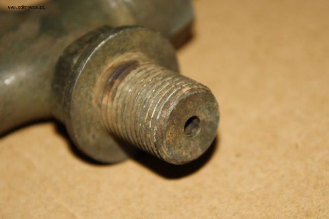 Cześć, chciałbym prosić o pomoc w identyfikacji przedmiotu. Jest to kranik o długości ok. 11 cm razem z gwintem o jednym wejściu i dwóch wyjściach (dwa dzióbki - z przodu i w dół). Widać, że rączka była drewniana bo na końcu zachował się kawałek drewna. Co ciekawe otwór wlotowy jest dosyć wąski w porównaniu do wielkości kranika - ok. 5 mm, więc podejrzewam, że nie służył on do puszczania wody. Tak na marginesie - wydaje mi się, że kranik jest nadal sprawny bo rączka chodzi na boki (nawet lżej niż w zamontowanych u mnie w domu w zeszłym roku bateriach rodem z marketu;), a górna nakrętka bez problemu się odkręca, więc po wyczyszczeniu w środku prawdopodobnie znowu mógłby działać.