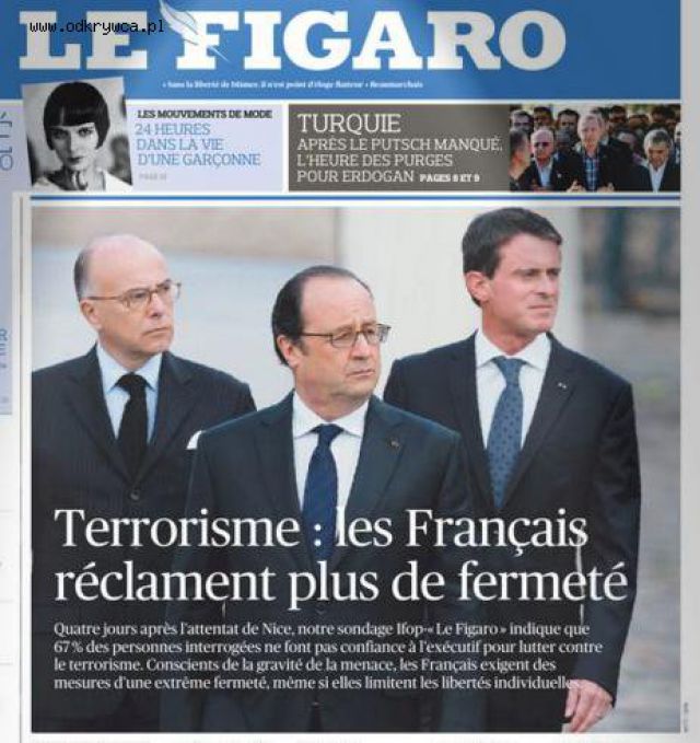grba Napisano 17 Lipiec 2016 Napisano 17 Lipiec 2016 Co media kochają? Badania socjologiczne...Francja. Po zamachu w Nicei 67% respondentów oświadczyło, że nie zaufania do rządu na okoliczność jego walki z terroryzmem, 81% gotowe jest przyjąć zwiększenie kontroli i związane z tym ograniczenia wolności.Duchu Sławomira Mrożka, który dla spokoju i łagodnego klimatu porzuciłeś Kraków i wyjechałeś do Nicei, co, ty na to!
