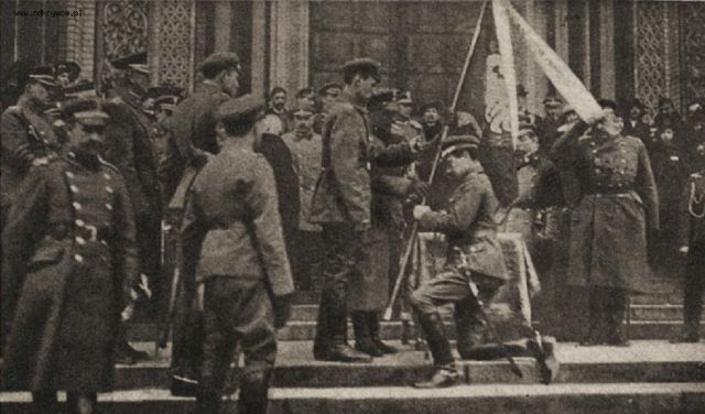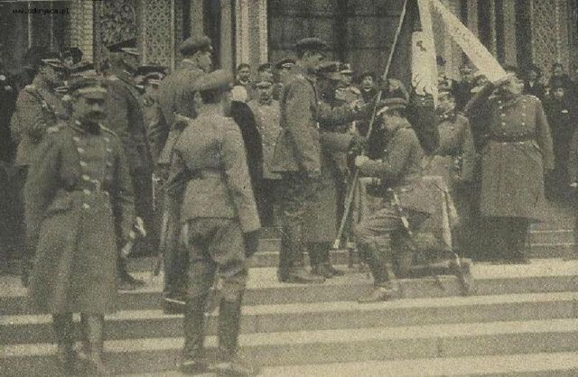 formoza58 Napisano 21 Listopad 2016 Napisano 21 Listopad 2016 Wręczenie pułkowi pierwszego sztandaru na stopniach cerkwi na Placu Saskim w Warszawie, w kwietniu 1919 roku.