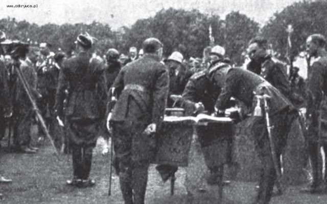 formoza58 Napisano 14 Kwiecień 2018 Napisano 14 Kwiecień 2018 Z wręczenia pułkowi pierwszego sztandaru na Placu Saskim w 1919 roku.Moment wbijania gwożdzi pamiątkowych.
