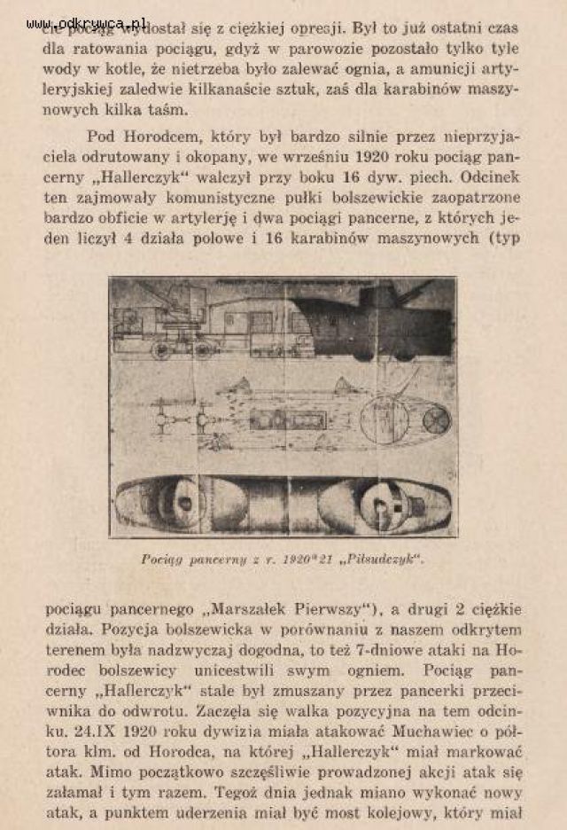 Krzysztof115 Napisano 14 Maj 2018 Napisano 14 Maj 2018 Miłej lektury !Zarys historii wojennej formacji polskich 1918-1920 Batalion elektrotechniczny, napisał kapitan Edward Fryzendorf, 1932.Z dniem 30 sierpnia 1919 roku zaczął nadchodzić do batalionu elektrotechnicznego sprzęt techniczny, zakupiony w Austrii przez polską komisję likwidacyjną w Wiedniu: reflektory polowe 60 cm, typu górskiego i reflektory polowe 110 cm firmy „Siemens-Schuckert” i elektrownie polowe: Fiat i Adler.{…} Z braku koni, a tym samym możliwości holowania reflektorów 60 cm typu górskiego w dniu 27 lipca 1920 roku utworzono 6 plutonów dla pociągów pancernych, skierowanych 30 lipca do Kierownictw Budowy Pociągów Pancernych w Krakowie i Nowym Sączu. Plutony te przybyły 10 sierpnia. Reflektory te zostały zamontowane w specjalnych wagonach pancernych i przydzielone do pociągów pancernych:1. pluton- por. Weryho, wagon bojowy z fabryki „Zieleniewskiego” –„Pierwszy Marszałek Polski”.2.pluton- por. Statkiewicz, wagon bojowy ?, P.P.2„Śmiały”.3. pluton – ppor. Walenty Kopczyński, wagon bojowy z Warsztatów Kolejowych w Nowym Sączu, P.P.18 „Huragan”.4. pluton – ppor. Nowina –Noiszewski , wagon bojowy z Warsztatów Kolejowych w Nowym Sączu, P.P.25 „Stefan Czarniecki”.5. pluton ppor. Poniemirski, wagon bojowy z fabryki „Zieleniewski”, P.P.20 „Bartosz Głowacki”.6 .pluton – ppor. Edward Fryzendorf wagon bojowy z ?, P.P.23 „Śmierć”/vel „Pogoń”/.Do pociągu pancernego P.P.18 „Huragan” pluton reflektorów pod dowództwem ppor. Kopczyńskiego, został przydzielony 21 sierpnia 1920, przy czym por. Kopczyński został mianowany starszym oficerem pociągu. Dowodził on drugą połową obsady pociągu, który wraz z pierwszą połową, dowodzoną przez dowódcę pociągu pancernego, por. Tuchołka - kolejno na zmianę - brała udział w akcji bojowej.W dniu 30 sierpnia 1920 roku pociąg pancerny „Huragan” po raz pierwszy walczy z wrogiem- zdobywając stację Zadwórze pod Lwowem.Oto wyjątki podanego przez obecnego kapitana rezerwy Kopczyńskiego (do dzisiejszych czasów ta, 15 stronnicowa relacja nie dotrwała) relacja ta opisu tych działań, w których pluton reflektorów ze względu na działania dzienne brał udział jako część składowa oddziału szturmowego pociągu pancernego:30.08. Zadwórze było zajęte przez nieprzyjaciela, lecz podobno 8 razy przechodziło z rąk do rąk. Za nami jechał dowódca 6 Armii na pociągu. Gdyśmy przybliżyli się na kilometr lub dwa do Zadwórza, otrzymaliśmy silny ogień artyleryjski. „Huragan” zaczął się odstrzeliwać, lecz nie wiedzieliśmy do kogo strzelamy. Po krótkiej chwili pociąg cofnął się za linię strzału.Wtedy postanowiliśmy, ażeby patrol wyszedł z prawej strony toru dla spędzenia przypuszczalnego obserwatora artylerii. W czasie cofania pociągu, jeden granat pękł pod wagonem, lecz szczęśliwie tylko jeden człowiek został ranny w nogę. Ze wspomnianym patrolem poszedłem ja, a pociąg został w tyle. Byliśmy ostrzeliwani przez karabiny maszynowe i piechotę i choć miałem tylko około 10 ludzi, nieprzyjaciel się cofał. Wkrótce spostrzegliśmy, że pociąg całą siłą pary przejechał obok nas po torze na stację Zadwórze. Ponieważ patrol był już prawie na wysokości stacji, więc przyspieszyliśmy kroku; niestety, już w tych domkach, z których do nas strzelano, t. j. na dradze w prawo od stacji Zadwórze, nie było przeciwnika. Przy dalszym posuwaniu się patrolu ogień wzmógł się. Ponieważ „Huragan” już przestał strzelać, więc wysłałem żołnierza z prośbą skierowania ognia na piechotę przede mną , lecz już się ściemniało i dowódca rozkazał patrolowi wracać.„Huragan” w kilka minut po wyjściu patrolu, otrzymał rozkaz zajęcia stacji Zadwórze, co było wykonane całym pędem; pociąg zatrzymał się na nieznanej stacji na kilka metrów przed rozerwaną szyną. Porucznik Tuchołka skierował ogień na linię kolejową w przypuszczeniu, że strzały pochodziły od pancerek nieprzyjaciela, co okazało się słuszne. Nazwałem ten bój ciężkim, gdyż pociąg otrzymał silny ostrzał. Po boju był cały spryskany błotem od granatów trafiających w tor”.