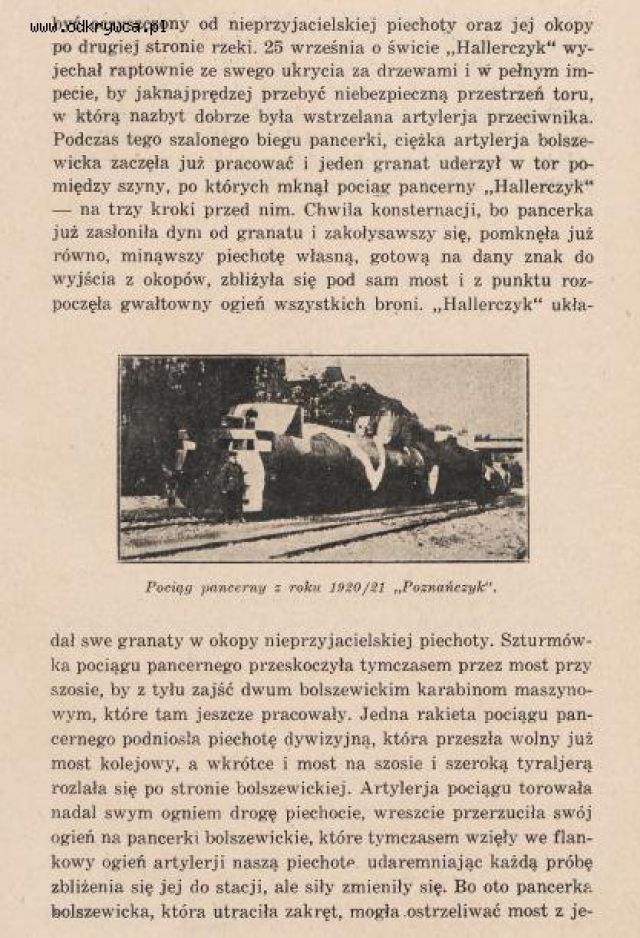 Krzysztof115 Napisano 14 Maj 2018 Napisano 14 Maj 2018 Part 3. 1 września 1920 r. pociąg pancerny „Huragan” ogniem swych dział wspierał działania piechoty w rejonie stacji kolejowej Zadwórze- przystanek Kutkorz, przy czym kilkakrotnie pociąg był ostrzeliwany przez artylerię pociągu pancernego nieprzyjaciela, lecz z dużej odległości. Od 2 do 5 września pociąg stał w odwodzie (w pogotowiu) przy moście na rzece Pełtwi, który naprawiała 3- a kompania kolejowa. 6 września most został naprawiony, co umożliwiło dalsze posuwanie się pociągu pancernego. Skorzystał z tego natychmiast por. Kopczyński i wsparł działania naszej piechoty na Krasne, uwieńczone zdobyciem tej miejscowości. Następnie pociąg pancerny „Huragan” stoczył pojedynek artyleryjski z 2 pancerkami sowieckimi, zmusił je do odwrotu; przy czym w jednym przypadku pancerka nieprzyjacielska cofnęła się po kilku strzałach „Huragana”, dowodzonego przez por. Kopczyńskiego, w drugim zaś wypadku pojedynek artyleryjski trwał około 2 godzin, pociągiem pancernym „Huragan” dowodził przybyły w międzyczasie jego dowódca, porucznik Tuchołka. Nadmienić należy, że w czasie tych walk pociąg pancerny „Huragan” posiadał tylko jedno działo czynne, gdyż w drugim, przy pierwszych strzałach zerwała się lufa z łoża i było ono nie zdatne do użytku. W dniu 7 września, w związku z zamierzoną ofensywą za Bug, „Huragan” został przerzucony na inny odcinek frontu, przez Lublin pod Kowel a następnie przez Brześć do Kobrynia, gdzie przebywał w odwodzie, nie biorąc już więcej udziału w walkach. Porucznik Kopczyński odesłany został do szpitala, gdyż podczas walk pod Krasnem spadająca z platformy szyna przygniotła mu nogę. Po zawarciu rozejmu z Sowietami w ciągu zimy „Huragan” odesłano do Poznania, zaś pluton reflektorów 60 cm z tego pociągu powrócił do swojego batalionu dopiero na wiosnę 1921 roku.END.