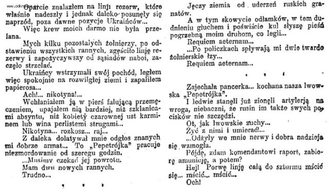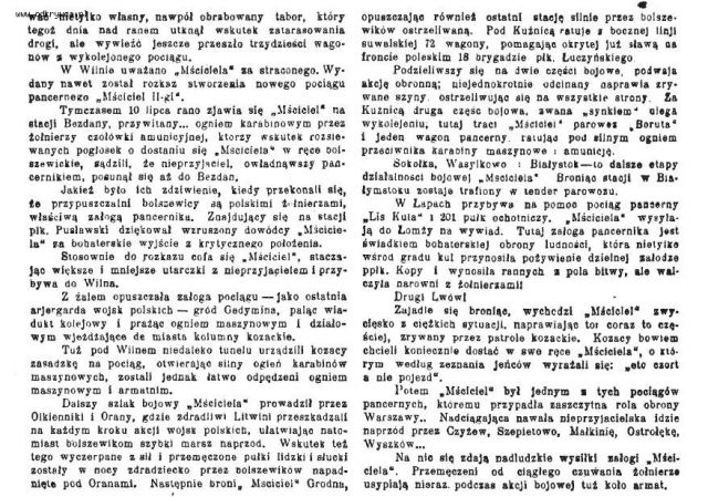 Krzysztof115 Napisano 14 Maj 2018 Napisano 14 Maj 2018 Part 2. W dniu 31 sierpnia do południa pociąg pancerny „Huragan” ostrzeliwał pozycje sowieckie za rzeczką Pełtew (około 4 kilometry od Zadwórza). Zgodnie z relacją kapitana Kopczyńskiego:….. „pomagaliśmy porucznikowi Łusce zdobywać dwór Pełtew, na prawo od stacji. Pociąg pancerny „Pionier” stał przed nami w stronę mostu na Pełtwi (rzeczka przed lasem, około 4 kilometrów od Zadwórza). Wkrótce od strzałów naszych coś się zapaliło we dworze. Piechota bardzo nam dziękowała za pomoc. Od południa por. Tuchołka odjechał z częścią załogi, a ja pozostałem jako dowódca pociągu pancernego. W czasie ostrzału dworu Pełtew również udałem się naprzód z telefonem i szturmówką, aby korygował strzały. Szturmówka rozeszła się szeroką tyralierą, ja byłem w prawym skrzydle, a jeden z sierżantów na lewym. Zachodziliśmy w bok nieprzyjaciela, nawet cośkolwiek z tyłu. Porucznik Łusko atakował od strony Lwowa. Zatrzymałem się w miejscu zakończenia kabla telefonicznego od mojego aparatu polowego, lecz sierżant z 5 ludźmi poszedł dalej, do samego dworu Pełtew i zawiadomił, że od strzałów zapalił się stóg słomy; ostrzał był trudny, gdyż musieliśmy odróżniać naszą piechotę od sowieckiej. O godzinie 20 wyjechaliśmy po wodę do Barszczowic, a po powrocie zajęliśmy czołowe miejsce przed zerwanym mostem na Pełtwi. Przez noc patrole pociągu chroniły front około 5 kilometrów w prawo i kilometr w lewo od toru. Nawiązaliśmy łączność z piechota z prawej i lewej strony. W czasie nocy czynny był też reflektor 60 cm, patrolując przedpole, przez co dodawał dużo animuszu załodze pociągu”.