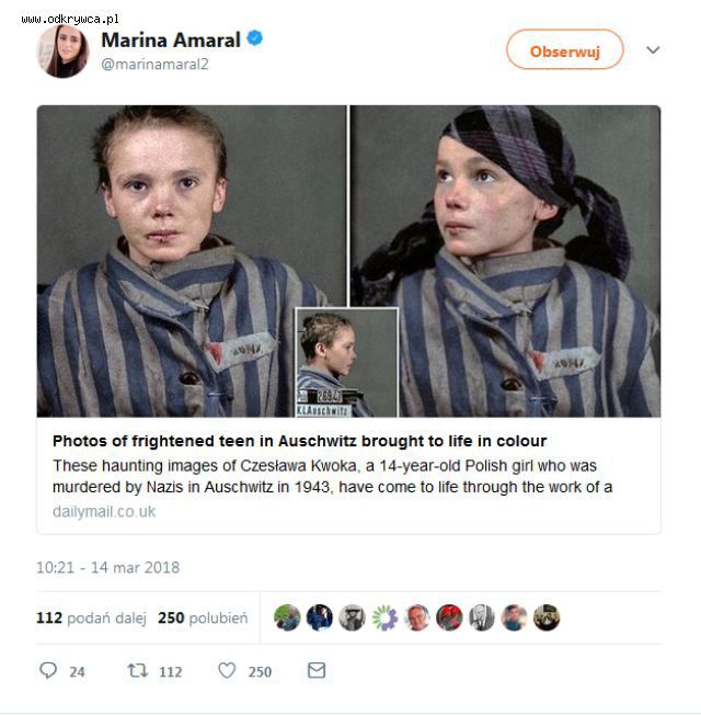 Czlowieksniegu Napisano 15 Marzec 2018 Autor Napisano 15 Marzec 2018 Muzeum Auschwitz-Birkenau opublikowało pokolorowane zdjęcia jednej z więźniarek, 14-letniej Czesławy Kwoki. To nie wróci tym dzieciom życia, ale uhonoruje je w jedyny możliwy sposób: zachowując pamięć o nich" - napisała jedna z internautek. Autorką pracy jest brazylijska artystka Marina Amaral, która specjalizuje się w tego rodzaju twórczości. Najpierw na Twitterze muzeum pokazało oryginalne fotografie Czesławy Kwoki i opisało jej losy, upamiętniając w ten sposób śmierć dziewczynki w obozie. Później zaprezentowało pokolorowaną wersję zdjęć. Te bardzo poruszyły internautów. [...]http://www.tvn24.pl/marina-amaral-pokolorowala-zdjecia-czeslawy-kwoki,822163,s.html
