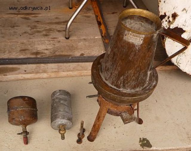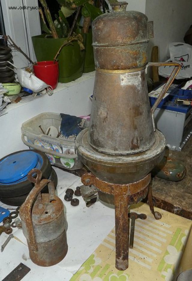 Znalezisko złomowe, naczynie ze stojakiem wyglądają na komplet, zasilanie elektryczne, gniazdo widoczne pod naczyniem. Tabliczka ma napis W.M. Iwiński, Warszawa, ul. Chmielna ....". Jedyne co znalazłem przez google to, że Walenty Marceli Iwiński miał przed wojną przy Chmielnej 7 interes związany z przyrządami aptecznymi, laboratoryjnymi i naczyniami. Widoczne po lewej zbiorniczki były odłożone przez właściciela złomu razem z tym naczyniem, nie mam pojęcia, czy którykolwiek ma coś wspólnego z przyrządem.