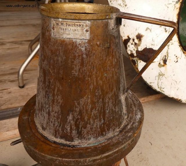 Znalezisko złomowe, naczynie ze stojakiem wyglądają na komplet, zasilanie elektryczne, gniazdo widoczne pod naczyniem. Tabliczka ma napis W.M. Iwiński, Warszawa, ul. Chmielna ....". Jedyne co znalazłem przez google to, że Walenty Marceli Iwiński miał przed wojną przy Chmielnej 7 interes związany z przyrządami aptecznymi, laboratoryjnymi i naczyniami. Widoczne po lewej zbiorniczki były odłożone przez właściciela złomu razem z tym naczyniem, nie mam pojęcia, czy którykolwiek ma coś wspólnego z przyrządem. Czy ktoś jest w stanie powiedzieć do czego to urządzenie służyło, ew. jak się fachowo nazywa? Albo dodać coś o jego producencie?
