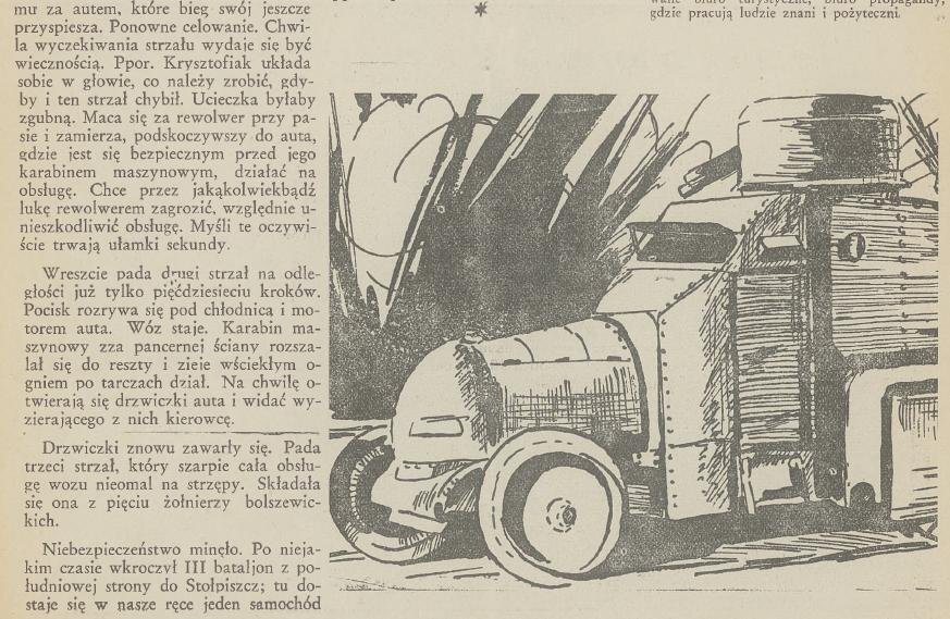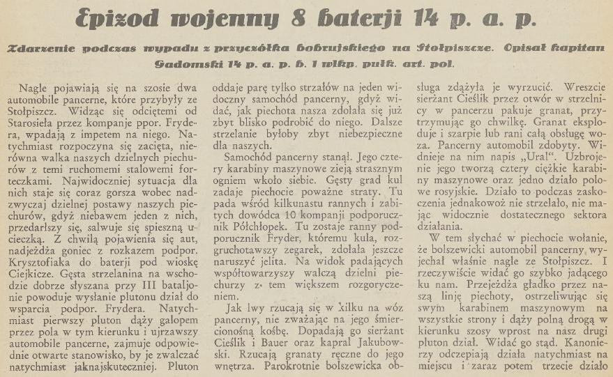 Samochód pancerny Lanchester zdobyty przy koncertowym współdziałaniu II baonu 2. pułku strzelców wielkopolskich (56. pp) i 8. baterii 3. pułku artylerii polowej wielkopolskiej (14. pap) pod Stołpiszczami. Na zdjęciu widzimy efekt trafienia z niemal "przyłożenia". Opis tej akcji znalazł się w komunikacie prasowym Sztabu Generalnego z 5 czerwca 1920 r.: