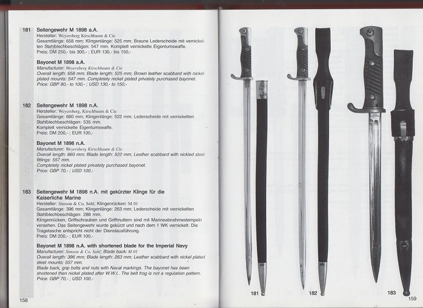 Seitengewehr 98 neuer Art, 04 oznacza rok przyjęcia na stan armii, w tym przypadku armii Królestwa Saksonii ( monogram panującego GR - Król Georg 1902-04) . Oznaczenie inspektora kontroli to litera E ,nie A. Skróconych bagnetów S98, używała marynarka Cesarstwa Niemieckiego ( dł. głowni 26-27 cm) ,poszukaj oznaczeń Kaiserliche Marine.