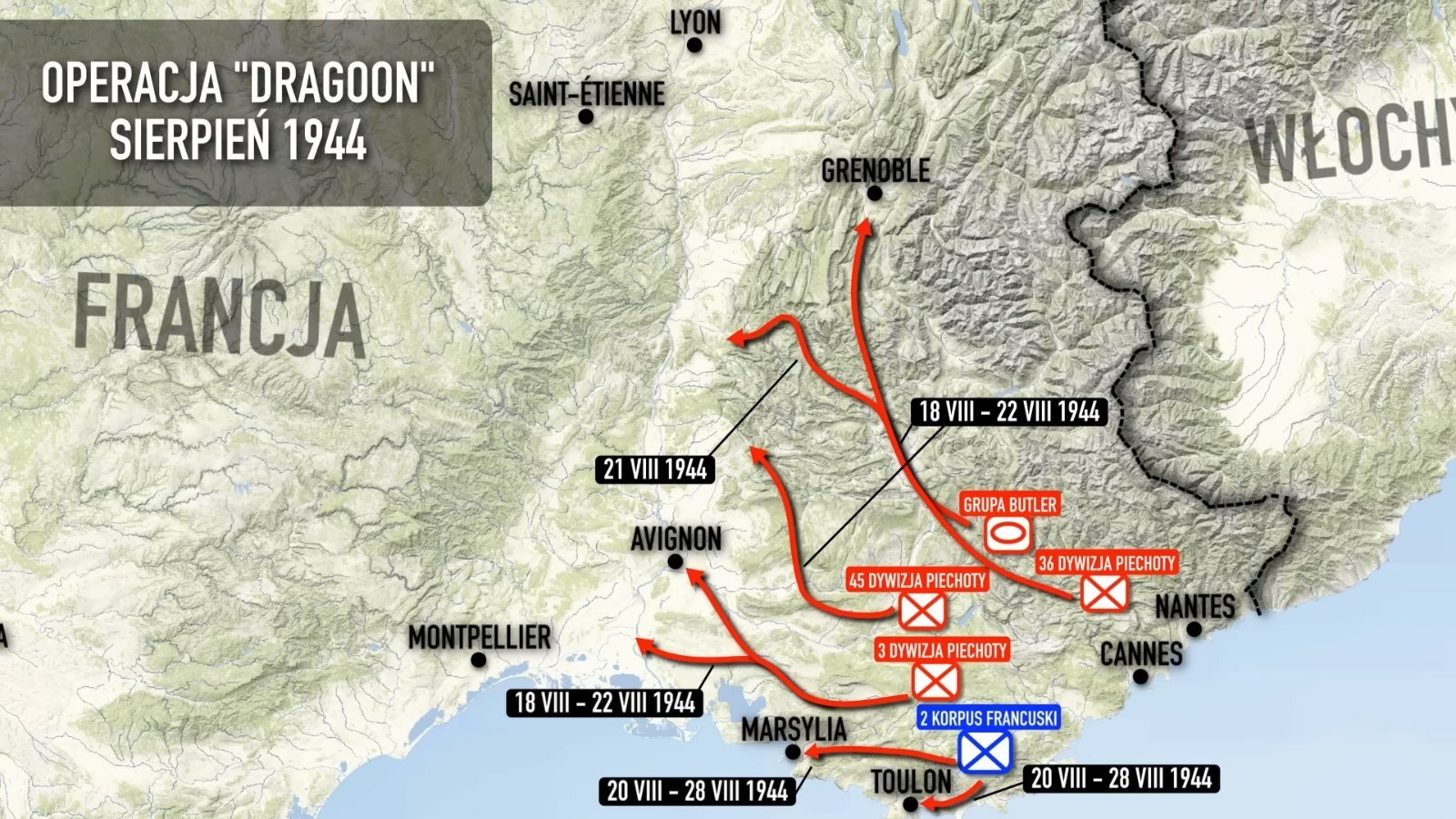 Jedburgh_Ops Napisano %s o %s Napisano %s o %s Ponieważ w Polsce na temat tego „D-Day numer 2”, czyli desantu alianckiego na południu Francji, wydano tak nieznośnie wielką liczbę książek, że nie zmieściłyby się w średniej wielkości pokoju, to Norbert Bączyk najwyraźniej nie wytrzymał tego istnego zalewu polskich publikacji na ten temat i zrobił podcast poświęcony temu wydarzeniu, czyli operacji „Dragoon” wcześniej planowanej pod kryptonimem „Anvil”. Polecam do posłuchania i obejrzenia, ponieważ jest lekki restyling serii podcastów Norberta Bączyka i Kamila Kawalca, dzięki czemu wraz z narracją kroczą bardzo sensowne mapy. Na zachętę do posłuchania podcastu wrzucam poniżej te mapy w takiej kolejności, w jakiej wymyślili to autorzy serii „Podcast Wojenne Historie”.