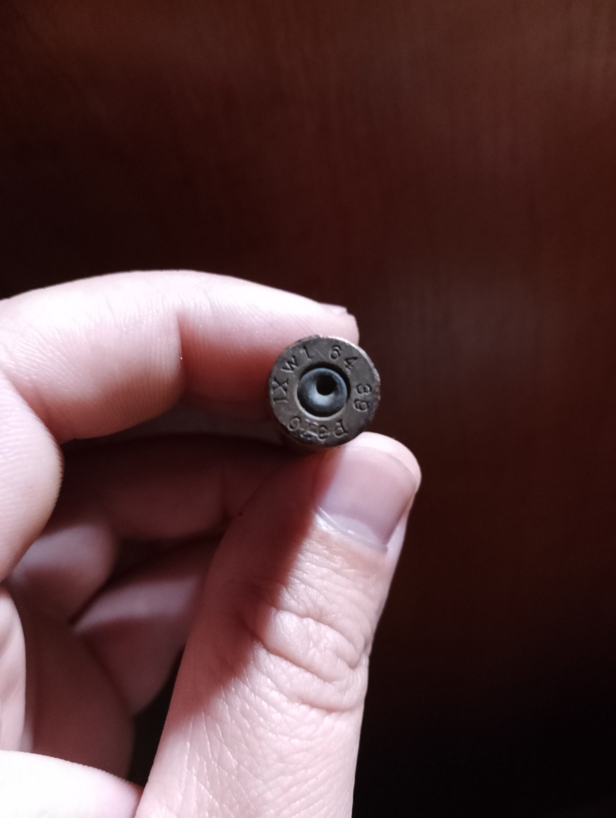 0 jarb Napisano %s o %s Napisano %s o %s Łuska naboju 7,9x57mm, czyli mauserowska. „P370” - producent łuski: Hugo Schneider A.G., Werk Berlin-Köpenick; łuska ze stali platerowanej mosiądzem (90% Cu): „IX” – producent stali: August Thyssen Hutte, Hamborn; „w” – zakład platerujący: Hugo Schneider AG Messingwerk Taucha/Liepzig; „1” – kod składu stali użytej do produkcji łuski; „64” – seria; „39” – rok produkcji 1939; Naboje scalane były z pociskami sS lub Platz 33 1
