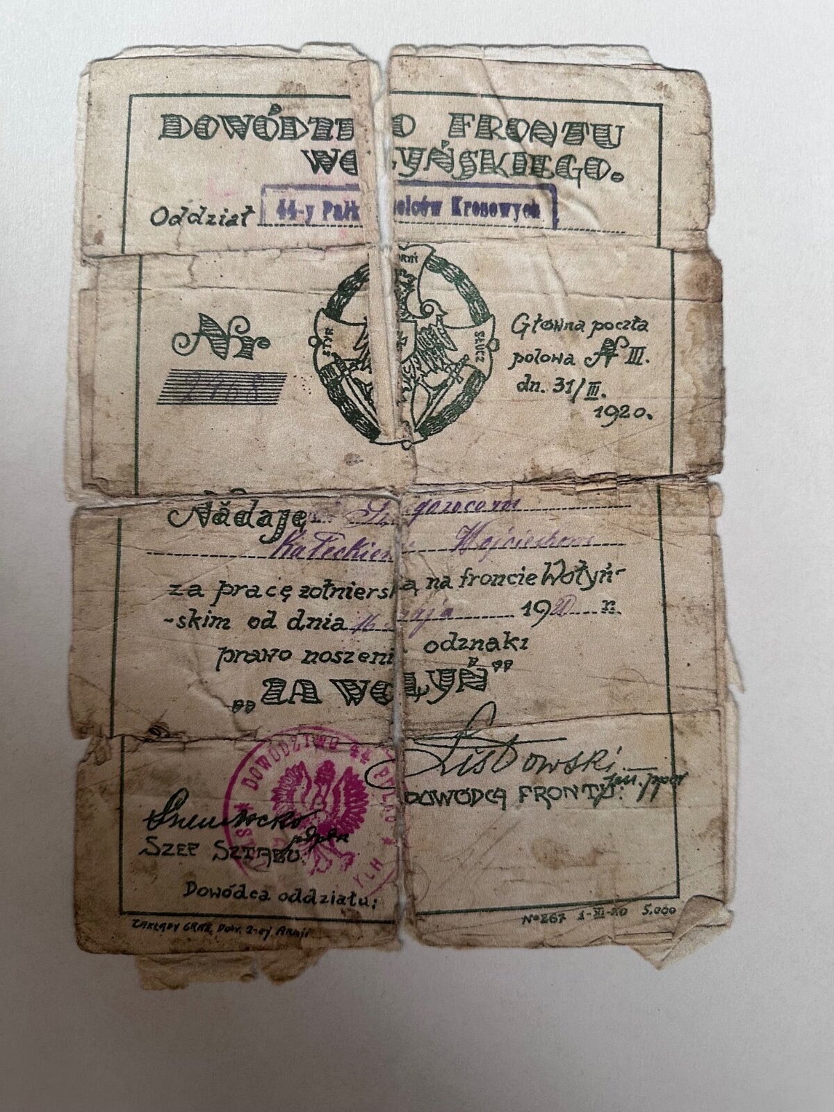 Szukam rodziny osób, które były uczestnikami w wojnie polsko-bolszewickiej na froncie Wołyńskim w 1920 roku, w oddziale 44 Pułku Strzelców Kresowych i posiadają odznakę „Za Wołyń” na której są wymienione miejscowości: Horyń, Słucz, Styr.