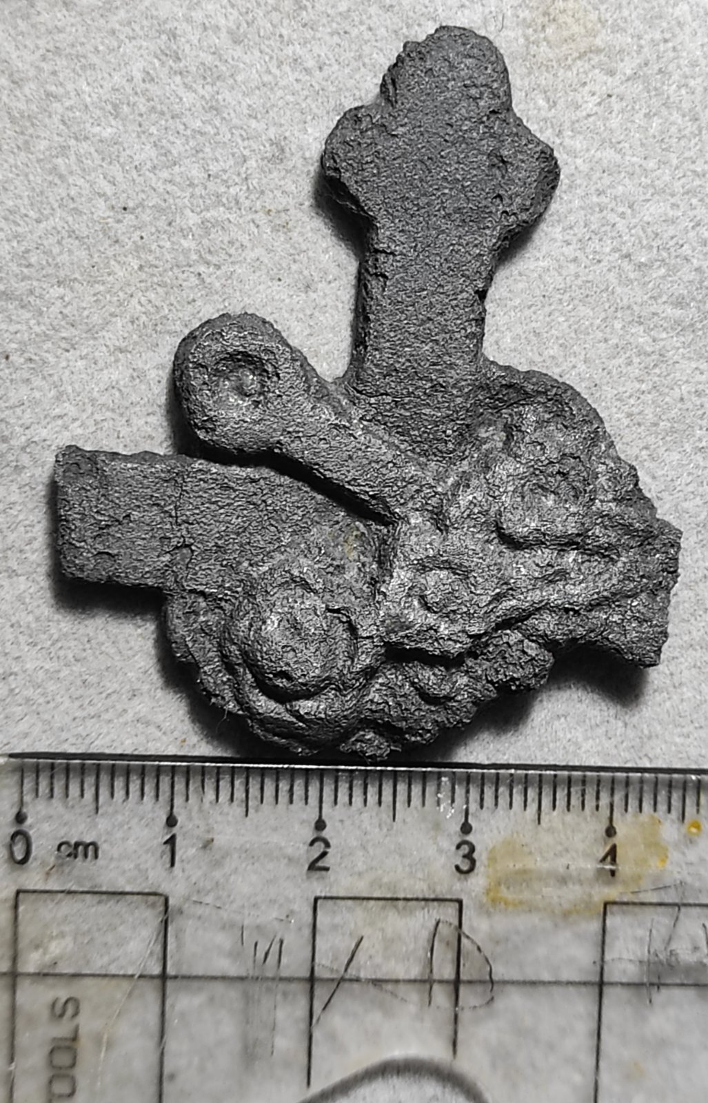 Witam proszę o identyfikację. Ozdoba widoczny krzyż i kwiaty? Materiał stop czegoś z cynkiem. Lekkie więc na pewno nie z ołowiem. Przedmiotem po oczyszczeniu.