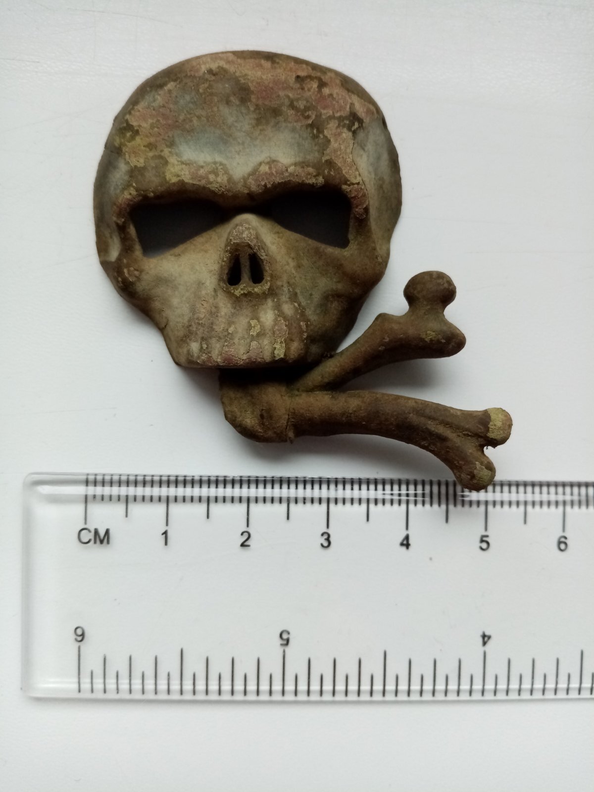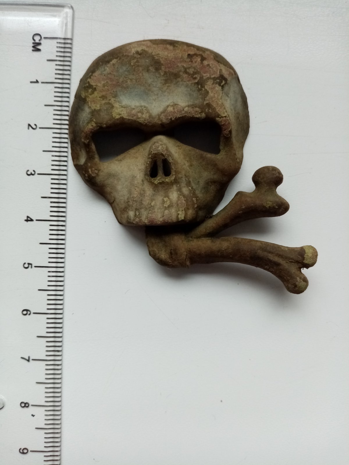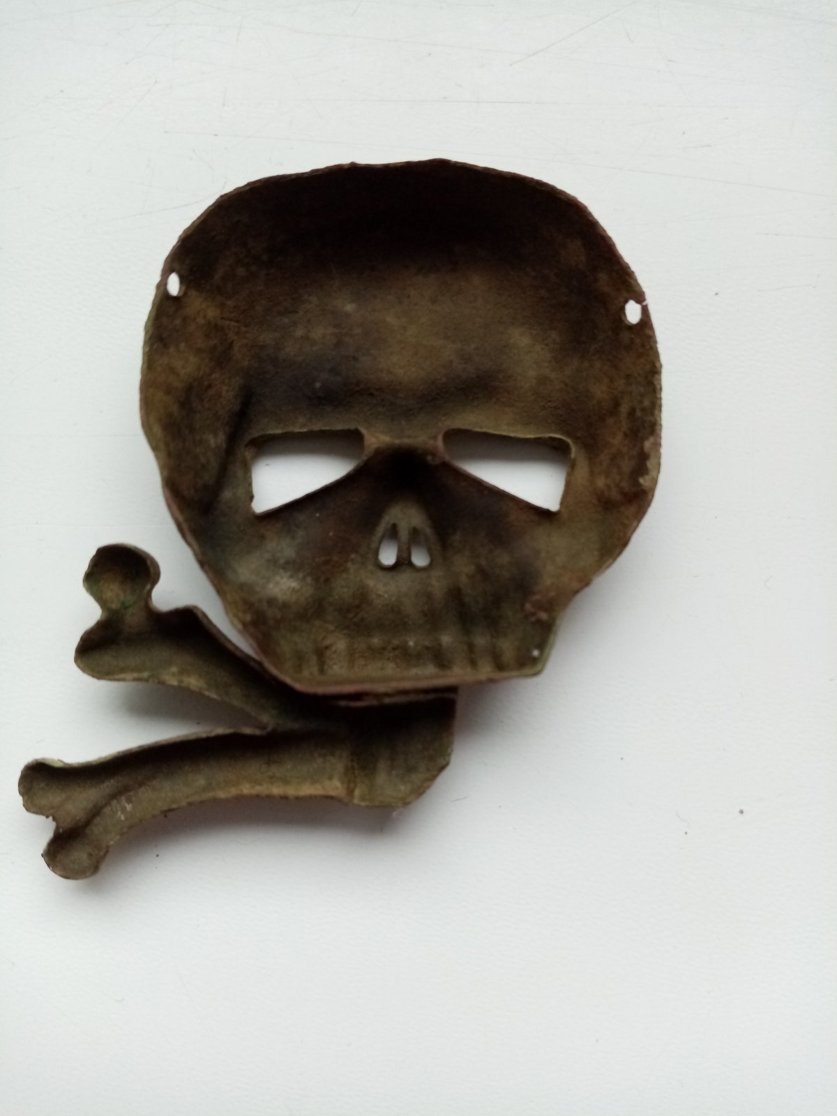 Witam Kolegów. Jeżeli ktoś z Was posiadałby jakąkolwiek wiedzę o tym przedmiocie to proszę o takie informacje. Czaszka z mosiądzu lub miedzi, raczej cienkościenna. Piszczele z czaszką zespolone są poprzez zgrzewanie ze sobą. Widoczne dziurki w okolicach skroni do mocowania za pomocą nici?. Brak jakichkolwiek śladów po wąsach do mocowania np.do materiału. Pochodzi z terenu gdzie występowały kiedyś guziki groszki, fenole, łuski mauser, wieńce od czapek(kapusty), odznaki i mundurowe haki oraz inny militarny chłamik. Proszę o info lub sugestie. W pobliżu nie występuje żaden cmentarz lub temu podobne miejsca.