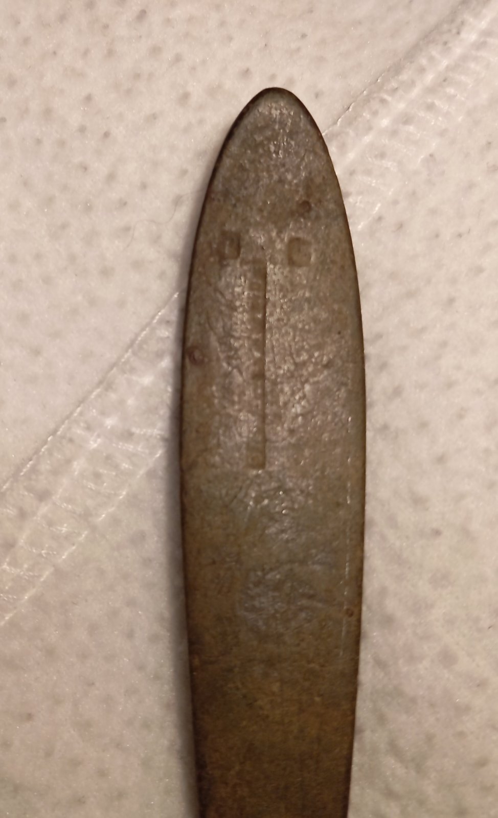Może ktoś kojarzy taki symbol na starej łyżce? Dodatkowo wygląda jakby ta łyżka była rowno zakończona. Jak łopata.