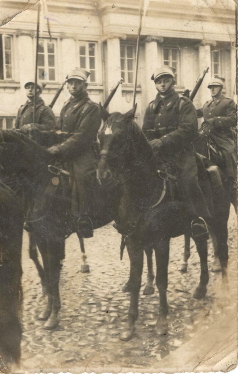 • 4. Pułk Strzelców Konnych w Płocku (budynek w tle przypomina ratusz lub sąd w Płocku).